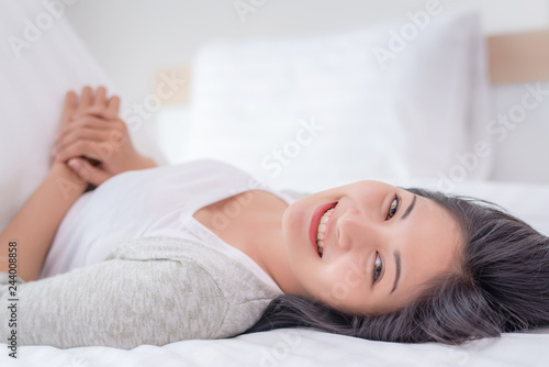 Beautiful young pretty Asian woman wake up and make happy smile with white shirt at the white bed in the morning.