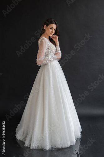 Beautiful young sexy model female bride with dark hair in gorgeous glossy long light wedding dress posing in dark studio