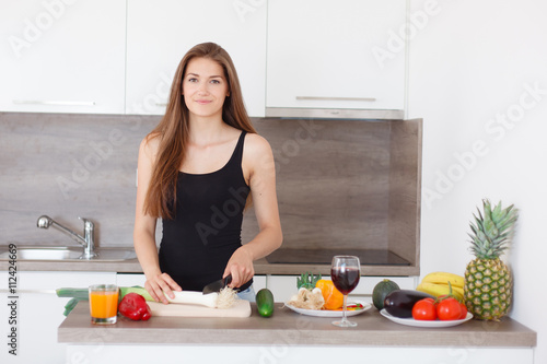 Beautiful, young, smiling woman cooking in the new kitchen.