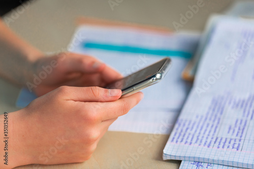 Beautiful young teenage school girl studying with smartphone, close up on hands with the mobile phone.