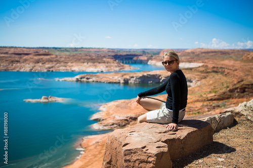 Beautiful young tourist woman watching lake Powell amazing panorama. Famous touristic places in USA. American city travel concept.