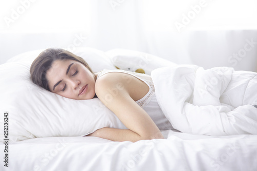 beautiful young woman basking in bed in the morning. Beautiful Model face looks sexy in camera