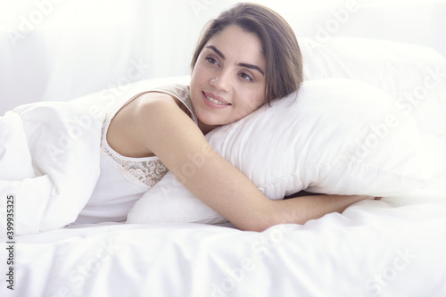 beautiful young woman basking in bed in the morning. Beautiful Model face looks sexy in camera