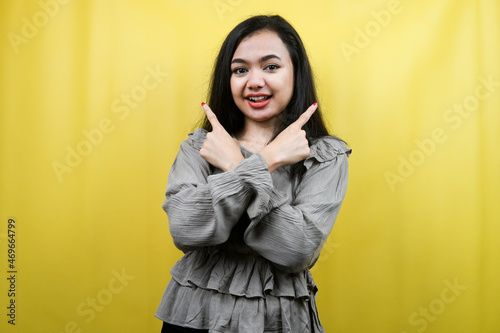 Beautiful young woman hands pointing at empty space presenting something, promoting products, advertising, isolated