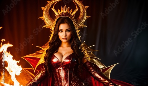 Beautiful young woman in a red leather dress and a golden helmet.