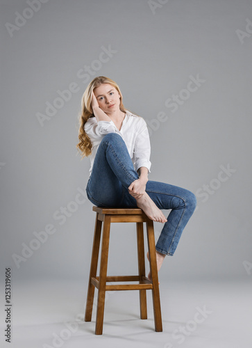 Beautiful young woman in stylish jeans sitting on stool against grey background