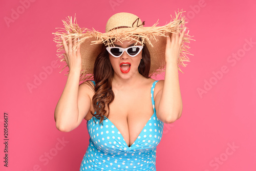 beautiful young woman in swimsuit wearing straw hat and sunglasses isolated on pink