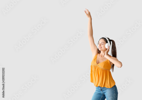 Beautiful young woman listening to music and dancing against light background