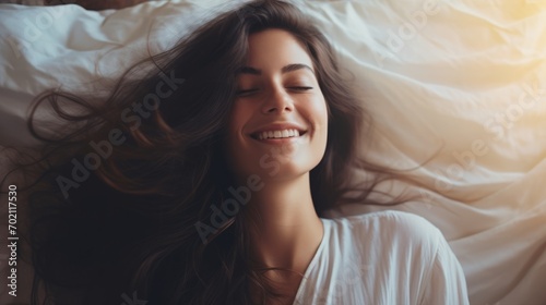 Beautiful young woman lying in bed and smiling. Close up. Generative AI