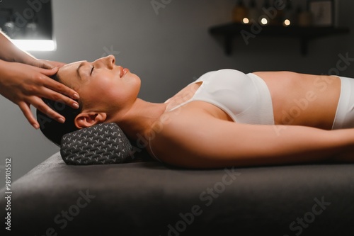 beautiful young woman lying relaxed in a spa salon and receiving facial massage