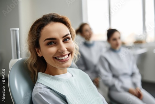Beautiful young woman patient sitting in dental chair and smiling at camera