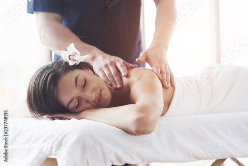 Beautiful young woman relaxing with hand massage at beauty spa.