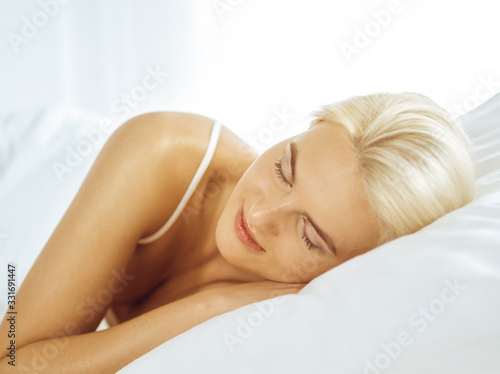 Beautiful young woman sleeping while lying in bed comfortably and blissfully. Good morning concept