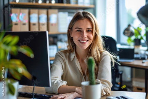 Beautiful young woman smiles at the camera while working in a modern office