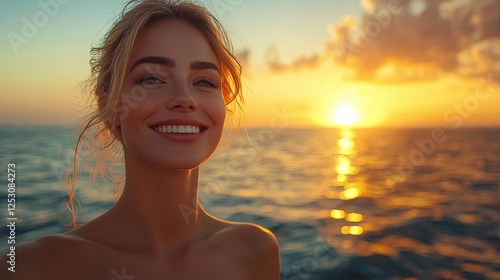 Beautiful Young Woman Smiling at Sunset on Ocean, Relaxation & Joy