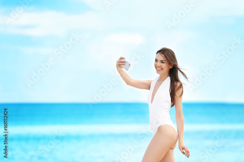 Beautiful young woman taking selfie near sea on summer day