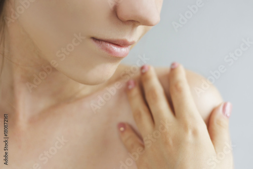Beautiful Young Woman with Clean Fresh Skin. Close up Portrait. Fashion Model Girl Face. Perfect Skin. Professional Makeup. Fashion shiny highlighter on skin, sexy gloss lips. Perfect manicure.