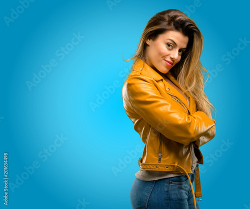 Beautiful young woman with crossed arms confident and happy with a big natural smile laughing, blue background