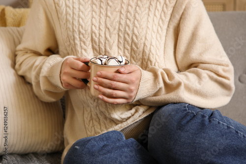 Beautiful young woman with cup of hot chocolate and marshmallows sitting on sofa at home, closeup