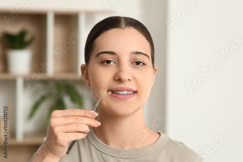 Beautiful young woman with dental braces and tool at home