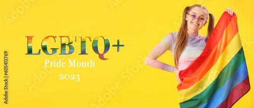 Beautiful young woman with LGBT flag on yellow background. Happy Pride Month