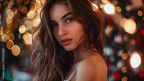 Beautiful young woman with long brown hair posing in a room decorated with christmas lights