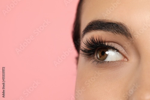 Beautiful young woman with long eyelashes on pink background, closeup. Space for text