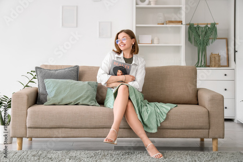 Beautiful young woman with magazine sitting on grey couch at home