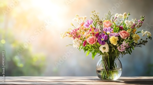 Beautifully Arranged Bouquet of Fresh Flowers in an Elegant Glass Vase Sitting on a Wooden Table Highlighting the Delicate Petals under Soft Natural Lighting