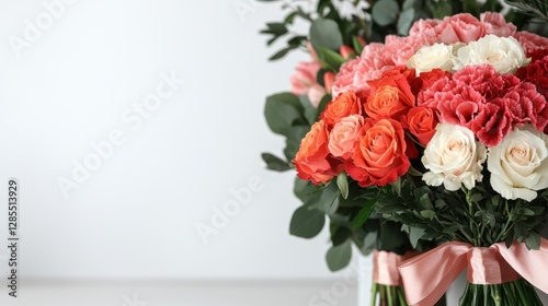 Beautifully arranged bouquets in a flower shop Concept, Elegantly Arranged Bouquets of Roses and Carnations in Vibrant Colors with Lush Greenery