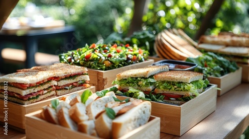 Beautifully arranged food platters featuring sandwiches, fresh salad, and bread, set on plates and wooden boxes for a corporate morning tea.