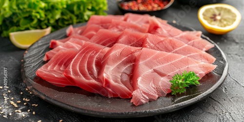 Beautifully arranged, fresh sliced tuna sashimi served on a black plate.