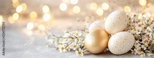 Beautifully arranged golden and white Easter eggs surrounded by delicate flowers and soft bokeh lights for a festive spring ambiance