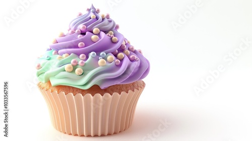 Beautifully crafted cupcake with a generous swirl of rich and creamy purple buttercream frosting adorned with a playful array of vibrant sprinkles in pastel hues