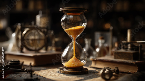 Beautifully crafted hourglass captures the passage of time in a vintage study setting filled with curiosities