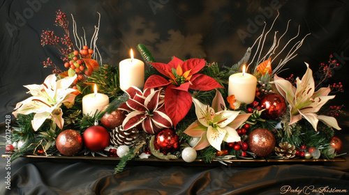 beautifully crafted table centerpiece featuring candles, flowers, and festive decorations, perfect for holiday celebrations and gatherings