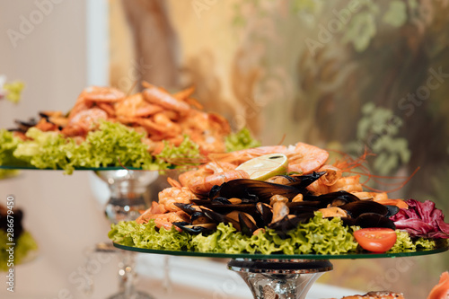 Beautifully decorated catering banquet table with different food snacks and appetizers on corporate christmas birthday party event or wedding celebration. Delicacies and snacks in the buffet.