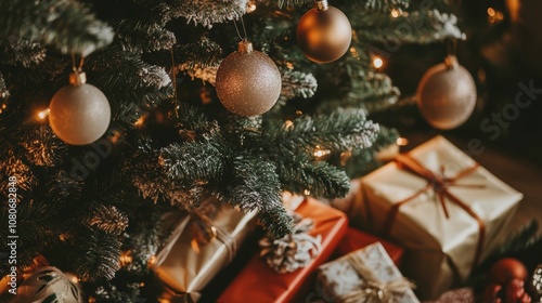 Beautifully decorated Christmas tree with glowing lights and colorful ornaments, presents arranged underneath