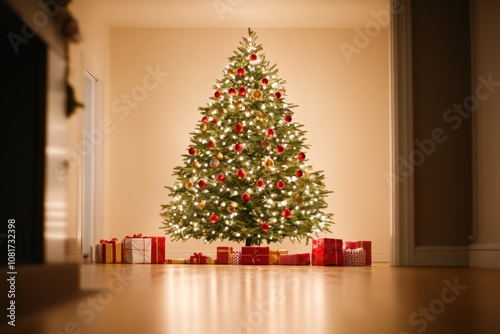 beautifully decorated christmas tree with red and gold ornaments and presents underneath