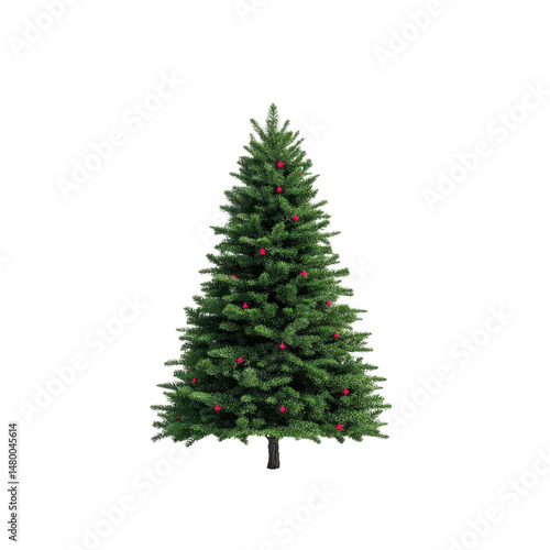 Beautifully decorated Christmas tree with red ornaments stands tall, evoking festive and joyful atmosphere. lush green branches are full and vibrant, perfect for holiday celebrations