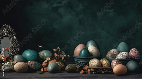 Beautifully Decorated Easter and Quail Eggs Displayed on a Dark Green and Moody Background in Celebration of the Easter Holiday and Spring - Generative AI