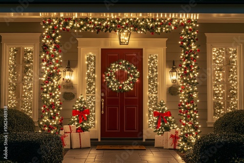 Beautifully decorated front door with Christmas lights and a red and white wreath, creating a festive atmosphere for the house.