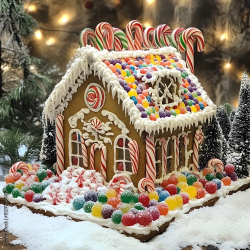 beautifully decorated gingerbread house with icing candy canes