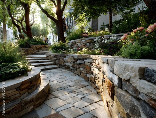 Beautifully designed garden with curved, multi-tiered retaining wall of stacked stone next to a paving stone path in dappled, peaceful sunlight.