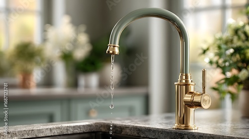 Beautifully designed modern kitchen with sage green cabinets and a brushed gold faucet, bathed in soft morning light. Photorealistic interior design photo.