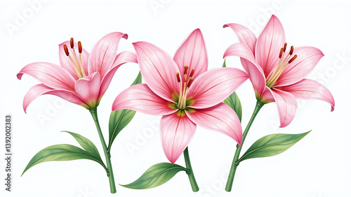 beautifully detailed watercolor illustration pink lily flower green leaves isolated white background