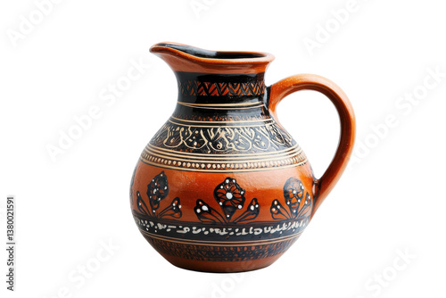 Beautifully handcrafted ceramic pitcher with intricate designs in warm tones and a glossy finish