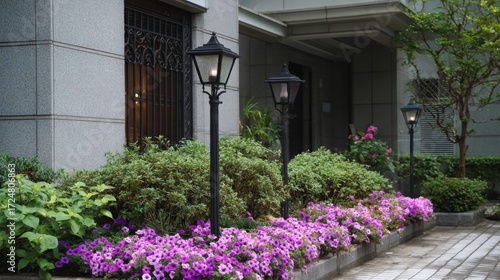 Beautifully landscaped courtyard with blooming flowers and elegant lanterns during early evening hours