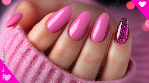 Beautifully manicured pink nails with a glitter accent during a relaxing day at home. Generative AI