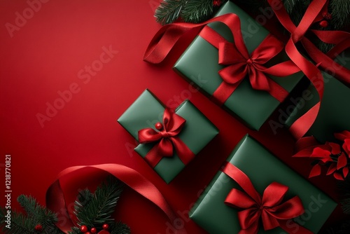 Beautifully wrapped Christmas gifts surrounded by festive decorations on a vibrant red background